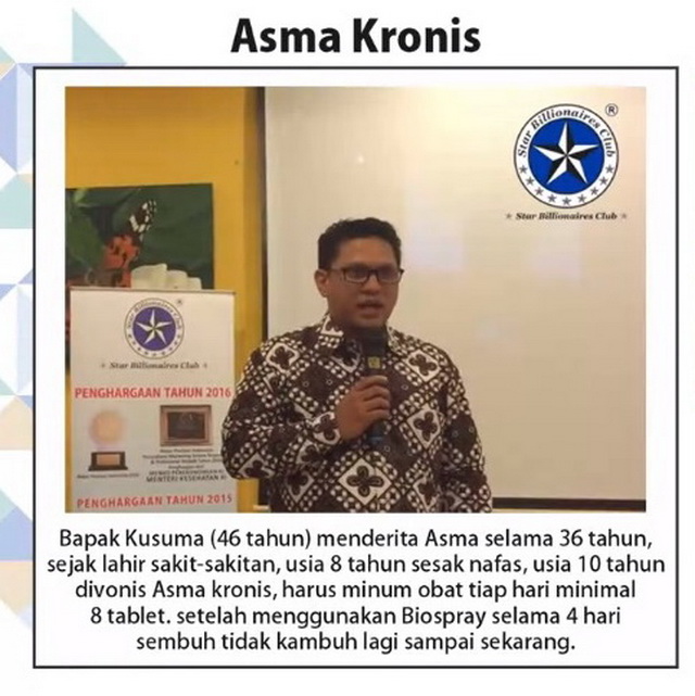 MANFAAT BIOSPRAYBiospray adalah Formula Protein yg dibutuhkan tubuh untuk melakukan Self Healing / Penyembuhan diri dari berbagai Penyakit seperti : Hipertensi, Diabetes, Jantung Koroner, Stroke, Gagal Ginjal, Komplikasi, Kanker, Tumor, Myom, Luka Gangren Diabetes maupun Kecelakaan, serta Gangguan Kesuburan - Kejantanan, dan segala penyakit akibat Penuaan.